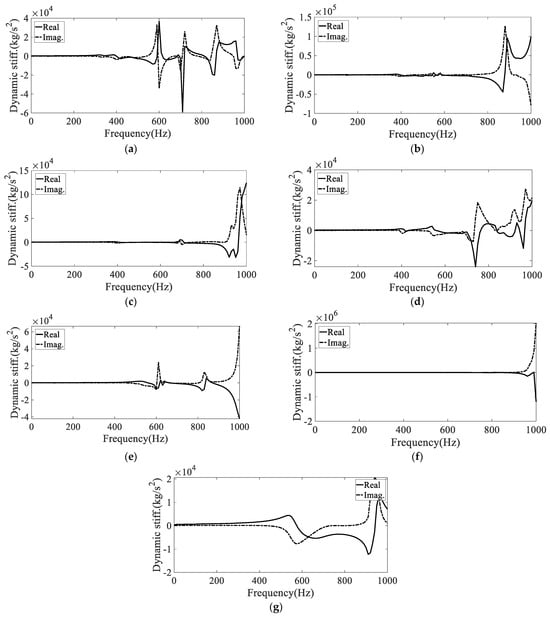 The test equipment, an Elastomer Test System (Model 831, MTS Systems Corporation, Eden Prairie, MN, USA), was employed to perform elastomer tests across a frequency range of 10 Hz to 1000 Hz, which represents the maximum available frequency band. The assessment was divided into two or three frequency intervals, to improve the efficiency of the elastomer tests. The test specifications of the three mounts are listed in Table 1. Considering the operational conditions, the rollrod mount required testing only in the X-direction, whereas the other two mounts required testing in all three directions. The test specifications are summarized in Table 1, and the measured dynamic stiffness results are shown in Figure 2. The real and imaginary values represent the dynamic stiffness and viscous damping coefficient of the tested mount, respectively. Several peak values were found at frequencies greater than 500 Hz because of the resonance frequency of the mount structure at the excitation frequency point.