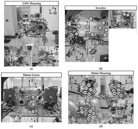 Attachment of 3-axial accelerometers: (a) GDU housing; (b) inverter; (c) motor cover; (d) motor housing.