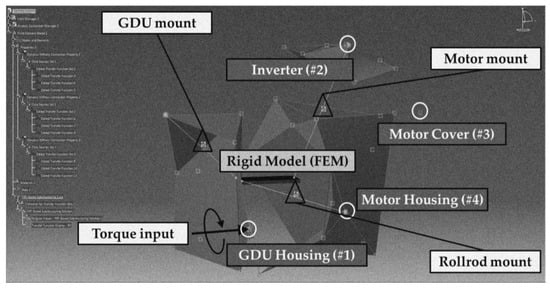 The simulation model for the 3-in-1 EDU subject to 3-point support was integrated with experimentally measured data and rigid finite element models. The modal parameters of the supported 3-in-1 EDU model were based on the values provided in the experimental modal test, whereas the mechanical dynamic characteristics of the mount modules responsible for the 3-point support were directly input, as illustrated in Figure 5. This integration process was conducted using Virtual.Lab software (version 13.10, Siemens, Munich, Germany), and the connecting nodes for the stiffness and damping values of the mounts were selected using three arbitrary points from a rigid finite element model. To ensure that the first resonance frequency exceeded 15,000 Hz in the dummy FEM, the finite element model was developed using Hypermesh software (ALTAIR/Troy, MI, USA) with a very high elastic modulus. Consequently, the three mounts were connected to a virtual rigid body, creating an integrated system in which the experimental data and finite element models were combined. These subcomponents were synthesized based on the GRC method, which is theoretically expressed in Equation (14). Each sub-component was assembled via the FRF-based sub-structuring option provided in the commercial Virtual.Lab SW, and the theoretical background was obtained using the GRC method.