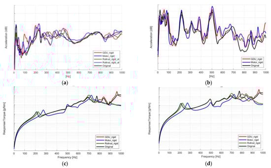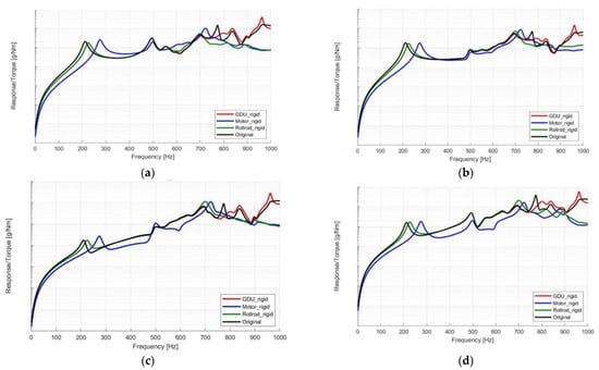 The three mounts were evaluated using the proposed hybrid 3-in-1 EDU model for four cases: original equipped mounts, rigid EDU mounts, rigid motor mounts, and rigid rollrod mounts. The original mount case represents the direct implementation of the measured dynamic stiffness data, as shown in Figure 2. To mimic the rigid behavior of the responsible mount, the rigid mount case was assigned by the increase in stiffness of each mount to more than 1000 times the original measurement across all frequency bands. The responses of the 3-in-1 EDU model were regarded as the evaluation indicator of NVH performance through selecting four measurement locations that could well represent the response of the main sub-components, the GDU housing (#1), the inverter (#2), the motor cover (#3), and the motor housing (#4), as illustrated in Figure 2 as white circles. The torque input was assigned near the location where the torque was generated during the operation of the 3-in-1 EDU in the experiment. The acceleration data for the four response positions (#1–#4) were measured under the torque input conditions, and the frequency responses of the four locations with respect to the torque input are plotted in Figure 6.