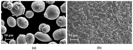 Silver (Ag) is a desirable material for many applications due to its antimicrobial and high thermal and electrical conductive properties [,,,,,]. Therefore, Ag is receiving increasing academic and industry interest as a base and alloying element for thermal, biomedical and electronics applications [,,,,]. Diamond (D) also has unique and desirable properties, including high hardness, excellent thermal conductivity, high electrical resistivity and high wear resistance [,,,]. Ag and D have excellent thermal conductivity properties of 430 W/(m·K) and 2200 W/(m·K), with a density of 10.49 g/cm3 and 3.52 g/cm3 and electrical resistivity of 1.6 × 10−8 Ω·m and 1.0 × 10−18 Ω·m, respectively. Hence, the combination of silver and diamond for numerous applications would be highly beneficial as the material could simultaneously meet the requirements of many industries for high thermal conductivity and electrified transport applications due to the thermal performance and lower density. However, due to diamond’s high melting point and strong covalent bonds, it is notoriously difficult to process using conventional manufacturing methods, and silver’s high reflectivity at infrared laser wavelengths makes it challenging to laser weld or manufacture using laser powder bed fusion (L-PBF) additive manufacturing (AM).