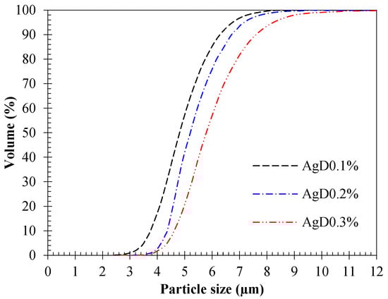 A Retsch Technology Camsizer X2 was employed to evaluate the particle size distribution. The Ag-D powder was mixed at different percentages by sieving for the dry measurement and the sample was conveyed into the equipment by using a powder dispenser and brush blade recoating technique. The L-PBF Ag-D powder feedstock volume fractions were analysed at D10, D50 and D90 to reveal the variation in the particle size distribution, which might hinder the processability of the powder, Figure 3 and Table 3. The Ag-D0.1% powder was shown to have a PVD of D10 of 3.7 μm, D50 of 4.8 μm and D90 of 5.2 μm, while Ag-D0.3% featured a PVD of D10 of 4.6 μm, D50 of 5.9 μm and D90 of 7.6 μm. It was found that the D10, D50 and D90 values heightened with an increasing diamond content, Table 3. Overall, the values showed that 90% of the Ag-D particles were below 8 µm. Positively, the Ag-D particles dominantly displayed that a powder with a spherical shape is preferred for the L-PBF process to increase the packing density, provide homogenous powder deposition as well as improve the flowability of the powder []. However, it needs to be mentioned that the presence of small satellite particles on the surface may hinder the maximum packing density.