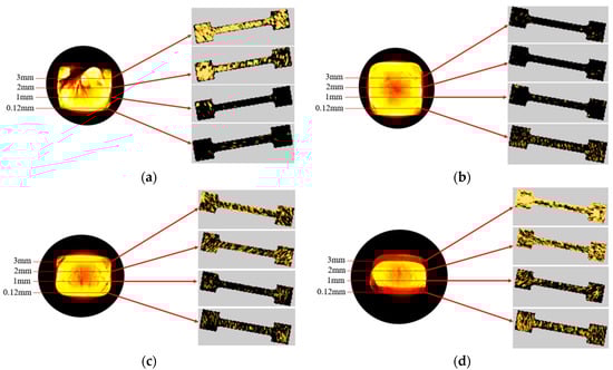 In AM processes, a wide range of parameters influence the melt pool behaviour. The impact of processing parameters on the melt pool form of different samples at various build heights are presented in Figure 7a–d. The melt pool dimension increased when decreasing the scan speed from 400 mm/s to 200 mm/s for sample 3 and sample 4 as presented in Figure 7a,b, respectively. This change in the melt pool dimension could be ascribed to the reduction in the energy density. Dilip et al. investigated the influence of process parameters on Ti6Al4V via melt pool monitoring and they reported that the depth of the melted region decreased with an increasing scan speed and eventually resulted in a balling phenomenon occurrence due to the reduction in energy density []. However, the melt pool dimension decreased with an increasing diamond content for sample 5 and sample 6 at 200 mm/s, indicating non-linear behaviour.