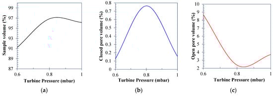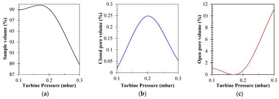 The xCT porosity data for the L-PBF Ag-D in situ alloys at different turbine pressures are displayed in Figure 9a–c. As the turbine pressure increased, the sample volume rose from 91% to 96%. The closed pore volume increased up to a turbine pressure of 0.8 mbar before dropping to 0.15% for a turbine pressure of 1 mbar. The open pore volume showed the reverse pattern of the closed pore volume; initially, the open pore volume decreased from 0.6 to 0.8 mbar and then increased to 3.8% for the 1 mbar produced. This result suggested that the 1 mbar turbine pressure provides the optimum turbine pressure to build dense built materials.