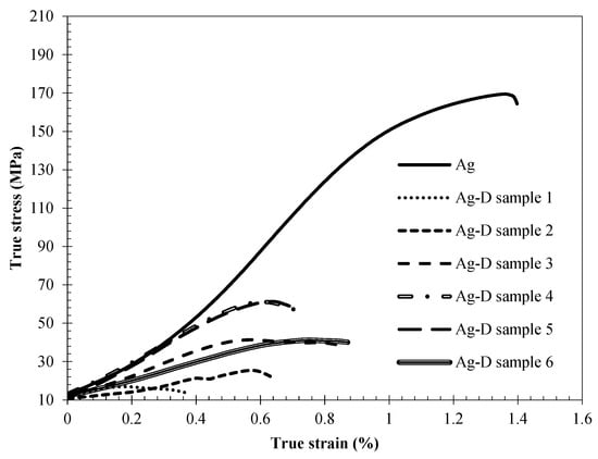 True stress–strain curves for L-PBF of Ag and Ag-D composite samples.