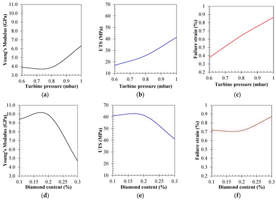 Mechanical performance of L-PBF Ag and Ag-D composite samples for (a,d) Young’s modulus (E), (b,e) ultimate tensile strength (UTS) and (c,f) failure strain () at varying turbine pressures and increasing diamond content percentage, respectively.