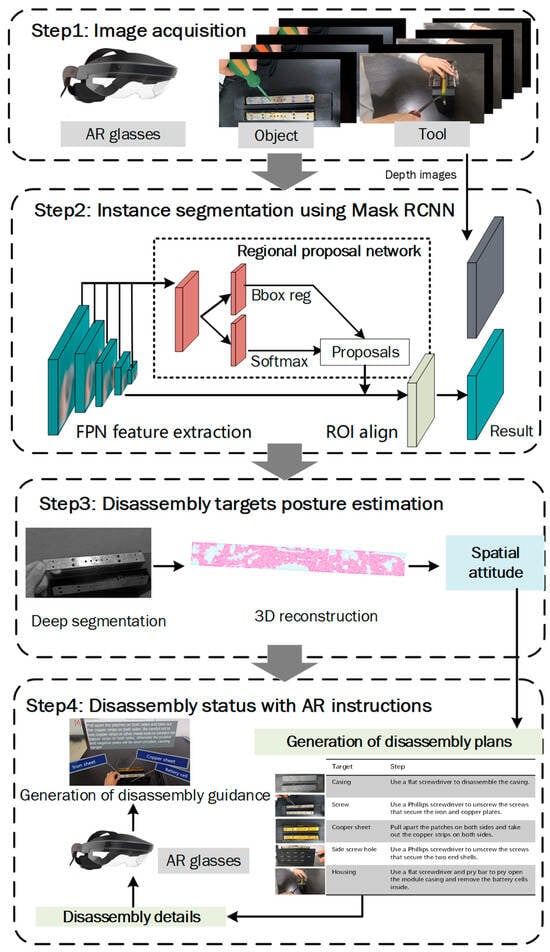 This research leverages the combination of AR and deep learning techniques to enhance the efficiency of disassembly processes. First, an instance segmentation algorithm is applied to the images acquired by the AR device, enabling the segmentation of the mask information for the parts to be disassembled. The mask information is then used to generate the depth information of the target parts and reconstruct it into a point cloud instance with a spatial geometric structure. The spatial poses and positions of the disassembled targets are estimated using the Iterative Closest Point (ICP) algorithm. Subsequently, the disassembly steps are retrieved based on a predetermined disassembly sequence diagram, and the corresponding AR guidance is displayed to assist the worker in completing the disassembly. The proposed approach is divided into four steps, as illustrated in Figure 1.