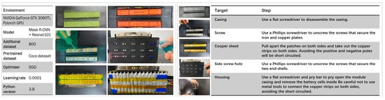 The obtained information (i.e., R and t) from the previous section can be used to derive the attitude information of the disassembly object in the scene, including the roll angle, pinch angle, and yaw angle, as well as the coordinate information. To improve the performance of the instance segmentation network in the AR-assisted disassembly environment, this section utilises specialised datasets that are closely relevant to the disassembly process for training and validating. The training dataset, comprising 1000 samples, is categorised based on the disassembly process of a retired vehicle power battery. During the training phase, the learning parameters and coefficients were iteratively adjusted to enhance the accuracy of the model.