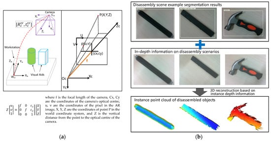 Depth information segmentation of disassembly objects: (a) schematic diagram of mapping between camera imaging and physical space; (b) generation of instance point cloud of disassembled objects.