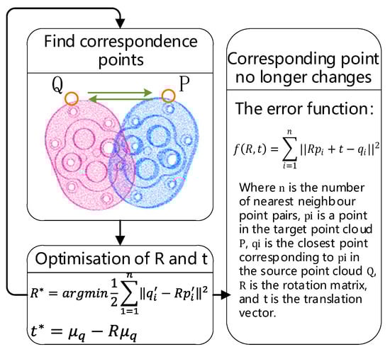 The ICP matching algorithm identifies the corresponding points between the target point cloud Q and the source point cloud P. It then applies the appropriate transformations, based on these corresponding points, to calculate the rotation matrix R and translation vector t. This calculation is achieved by minimising the geometric differences between the source and target point clouds. The source point cloud obtained through the depth camera is P = {p1, p2, p3…pn}, and the target point cloud is Cambria Math. The point cloud P represents the coordinate system of the camera, while the point cloud Q represents the coordinate system of the space where the point cloud of the 3D virtual disassembly object is situated. Subsequent to transforming the source point cloud, the transformed point cloud identifies the corresponding points. The error between the source point cloud and the target point cloud, when affected by the transformation matrix, is represented by the equations in Figure 5. The solution is to identify the nearest neighbour point (pi, qi) and then calculate the optimal matching parameters, R* and t*. In this way, the error function is minimised. If the error is below a threshold value set to ensure alignment accuracy, the corresponding transformation matrices R and t are outputs. Conversely, if the error exceeds the set threshold value, the optimisation of the transformation matrix continues iteratively.