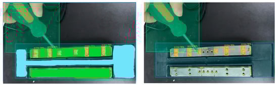 The dataset is split into the training set, validation set, and test set, with a distribution ratio of 7:1:2 in terms of the number of images included. The training set is utilised to train the model and determine its parameters. The validation set is used to determine the network structure and adjust the model’s hyperparameters. The test set is employed to evaluate the model’s generalization ability. To present the practical disassembly scene, images were taken of the disassembly process from a first-person perspective were annotated, as illustrated in Figure 6.