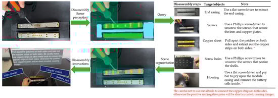Scene perception technology can identify the components, parts, and corresponding tools that need to be disassembled. However, a comprehensive presentation of all identification results to the user through augmented reality (AR) glasses, as depicted on the left side in Figure 7, can result in an information overload, hindering operators from comprehending the key points amidst the abundance of chaotic information. Moreover, a substantial quantity of instance segmentation results could obscure real objects, thereby impeding personnel operations. Hence, segmentation processing is essential in disassembly scenarios to provide appropriate disassembly guidance, display scene perception results, and coordinate subsequent operations. In this research, an approach for judging disassembly operations and recommending disassembly guidance is proposed, leveraging tool attention. As depicted in Figure 8, the real-time disassembly scene is initially captured through scene perception. The subsequent operations of the operator are then determined in the disassembly sequence, considering the tools utilised and the progress of module disassembly. Afterward, the scene undergoes segmentation, and the objects slated for dismantling are visualised to the operator through AR technology, serving as a guide during the disassembly process. For instance, when the operator grasps a cross screwdriver, scene recognition can identify that the operator is holding the screwdriver. Based on previous disassembly experience, it indicates that the operator intends to unscrew screws. Consequently, employing the tool attention mechanism, the AR glasses exclusively highlight and display all the screws that need to be unscrewed to the operator.