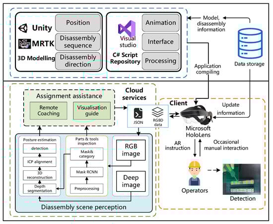 The developed AR-assisted disassembly system combines wearable AR technology, server-side processing, and custom data transmission methods to provide real-time disassembly instructions and assistance. By leveraging instance segmentation, depth data, and 3D models, the system offers valuable guidance to on-site operators, enhancing disassembly stability and efficiency. It consists of the design section, for the generation of AR-assisted disassembly instructions, and the application section, for the implementation (as shown in Figure 9). Within the design section, Unity3D, a development platform, is used to create the visual elements and spatial layout that are overlaid onto the physical view. Unity3D is employed to design the content and spatial position of the AR command, taking into consideration the process information of the product to be disassembled, as well as the user’s posture and position in physical space. Emphasis is placed on user-focused design, to prevent any obstruction of the user’s line of sight and ensure the completion of the primary scene in augmented reality. Additionally, the control script of the system is developed using Visual Studio, including loading disassembly animations, setting up communication interfaces, and processing data. It acts as the bridge between the Unity3D-designed visuals and the systems’ functionality. The application is designed for the Hololens, a mixed reality device. The application is then published to the Hololens client, allowing users to interact with the augmented content in their physical environment. In the application section, implementing the deep learning approach used in this study directly on mobile or wearable AR devices within the application environment is challenging, due to limitations in hardware and software. In order to address this challenge and enhance system responsiveness while alleviating the computing burden on the client, the system implements the client–cloud service model.