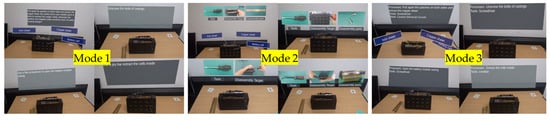 The scene awareness module triggers pertinent disassembly-related information, given the recognition results obtained from the current disassembly scene. The user wears HoloLens glasses for vehicle power battery disassembly, with the scene perception module processing the data captured by the HoloLens device. The respective recognition results displayed as virtual indicator boxes within the augmented reality space. Consequently, relevant disassembly process information and the working principle are visually presented as text within the augmented reality space. To improve the user experience, users have the option to activate AR-assisted functions at any point during use. Various working modes (Mode 1, Mode 2, and Mode 3, as shown in Figure 10) enhance user experience. These modes offer voice control capabilities and feature distinct user interfaces. For instance, Mode 1 employs a text-based interface to display specific disassembly instructions, including information about the required tools and task details. Mode 2 adopts an image-based interface, replacing text with visual representations of disassembly objects and tools. Mode 3 provides a simplified version that emphasizes the disassembly tasks and associated tools.
