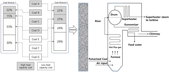 From the viewpoint of combustion sources for the coal-fired power plant, coal can be classified into high-heat-capacity coal and low-heat-capacity coal depending on how many calories (i.e., energy) can be generated during combustion. The high-heat-capacity coal has better combustion characteristics so it is expensive. On the contrary, the low-heat-capacity coal can produce fewer calories and emit more harmful pollutants during combustion. However, it is cheaper than the high-heat-capacity coal [9]. Some coal-fired power plants located in developed countries use only high-heat-capacity coal regardless of its high price [10]. It is easy to decide operational parameters to reduce harmful emissions in this case. However, most coal-fired power plants operated in developing or underdeveloped countries use both types of coal as a mixture in order to reduce electricity generation costs. This coal mixture makes the operation of coal-fired power plants difficult. Since each coal has different properties depending on substance composition, the mixture of high-heat-capacity coal and low-heat-capacity coal shows diverse combustion characteristics depending on the ratio of the mixture. The emission also varies after combustion with differently mixed coals. Therefore, it is important to decide a proper mixture ratio between high-heat-capacity coal and low-heat-capacity coal considering their composition. Therefore, the decision on the mixture ratio is important in the coal-fired power plant and there are divisions consisting of specialists to do this.