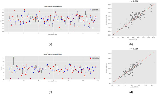 Figure 4a,c shows the residual error between the actual SOx and NOx and the predicted SOx and NOx as a graph. To validate the prediction performance of the predictive model with the highest performance, the correlation coefficient r of Pearson correlation analysis is used. In the DNN model used in this study, the correlation coefficient between the actual and predicted value is r = 0.866 and 0.916 for SOx and NOx, respectively, which means that they have a strong correlation. Figure 4b,d show the correlation between the actual SOx and NOx and the predicted SOx and NOx as a graph.