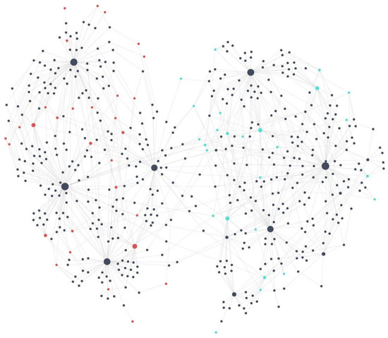 Graph view of the interviews (larger dark blue dots), extracted interview statements (smaller dark blue dots), and emerging themes for the car domain (light blue dots) and the packaging machine domain (red dots). The grey lines connect each statement to the interview it originated from as well as the emerging theme it was summarized into.