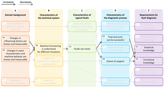 So far, both domains were compared regarding domain-specific aspects of fault diagnosis, but the main aim of the present study was to identify how these aspects relate to each other. Those factors leading to differences in the diagnostic process were selected and summarized in the Domain Requirements Model (see Figure 2). The contents of the model will subsequently be described, starting with the observed difference in the diagnostic process (i.e., column D) and moving along the connections to the domain background, system characteristics, and typical faults (i.e., columns A through C). Finally, the requirements associated with the diagnostic processes (i.e., column E) are explained.