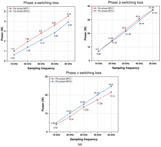 Regarding the conduction loss acquired through the two MPC approaches, the difference in the conduction loss between the two techniques under different sampling frequency conditions is small. The phase switching loss acquired through per-phase MPC2 is the lowest, as shown in Figure 13a. This switching loss is lower than that of per-phase MPC1 by about 20–30%. However, because the switching losses in the remaining phase legs increase, the two per-phase MPC methods have a similar total loss.
