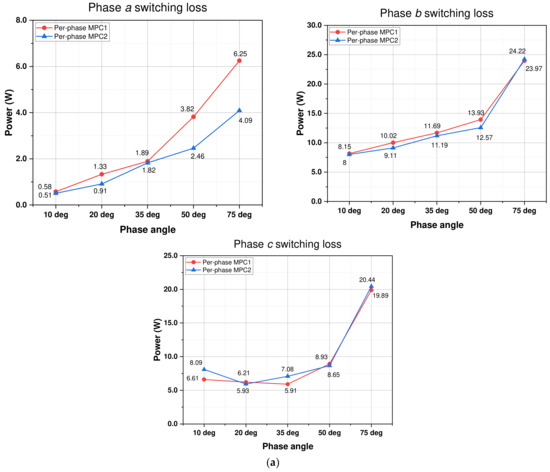 Regarding the conduction loss acquired through the two approaches, the difference in the conduction loss between the two techniques under various output powers is small. The switching loss of phase acquired with per-phase MPC2 is the lowest. This switching loss is lower than that of per-phase MPC1 by about 20–35%, as shown in Figure 16a. However, because the switching losses in remaining phase legs increase, the two per-phase MPC methods have similar total losses.