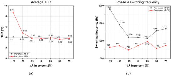 Parameter uncertainty can degrade the control system’s performance and even affect the system’s stability. In the MPC technique, the prediction model critically relies on having accurate load parameters. Figure 8 shows the behavior of the output currents and switching state under a load inductance mismatch obtained with only the per-phase MPC1 and per-phase MPC2 methods. The same condition is applied to the load inductance as in the parameter mismatch of the dc-link voltage. In the first part of the waveforms, the equivalent inductance is half of the actual inductance; the middle shows that the equivalent inductance is correct; and the last shows that the equivalent inductance is 1.5 times higher than the actual one. The same condition is tested for the load resistance in Figure 9. It can be seen from Figure 9a,b that the output currents obtained from the two approaches are properly controlled with a sinusoidal form and an accurate magnitude. However, the current ripples obtained by per-phase MPC1 are slightly higher than those of per-phase MPC2. Additionally, the switching frequency decrease capability under per-phase MPC1 is decreased when the equivalent load inductance is higher than the actual load inductance. In terms of the parameter mismatch of the load resistance, both per-phase MPC1 and per-phase MPC2 properly control the output currents with negligible ripples. The switching frequency decrease capability is not degraded. Therefore, it can be concluded that per-phase MPC1 is affected by the parameter mismatch of the load more than per-phase MPC2.