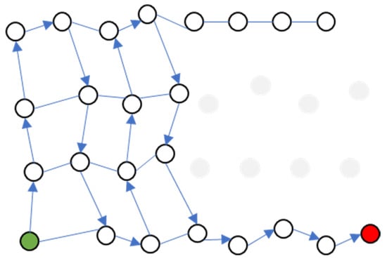 Extending Figure 3, in this example, the final graph after computation of weights is given in Figure 4. In this illustration, the green point denotes the starting point, the arrows indicate the direction of path traversal, and the grey points represent the restricted areas. As shown in Figure 4, there are some use cases where the path planning will reach a “dead-end”—meaning that all surrounding nodes are either already visited or are within restricted areas with no other eligible nodes available—whereafter the algorithm automatically switches to Dijkstra’s algorithm for localised path planning. This is illustrated in Figure 4, where the red point indicates the switch. The final escape path is depicted in Figure 5. This mechanism allows the algorithm to effectively escape the “dead-end” while avoiding the restricted areas, thereby identifying the next unvisited compliant node. This is repeated recursively until all nodes have been visited.