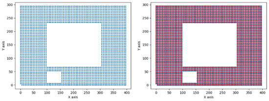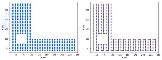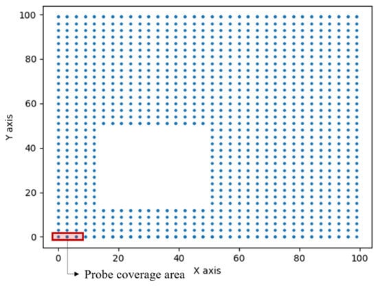In the simulation configuration, a two-dimensional sample space was computationally generated, structured as a grid with discrete vertices, denoted as , at intervals of six units. Each encapsulates explicit x and y coordinate values, representing its spatial position within the bi-dimensional domain. Additionally, within this sample space, a specified area with x and y coordinates ranging between 15 and 50 is explicitly demarcated as a prohibited area. This area serves as a simulation mechanism to represent physical obstacles or impassable regions within the sample space. In Figure 6, the red region denotes the coverage area of the probe, with a width of three units. The blue dots signify the discrete vertices within the sample space grid.
