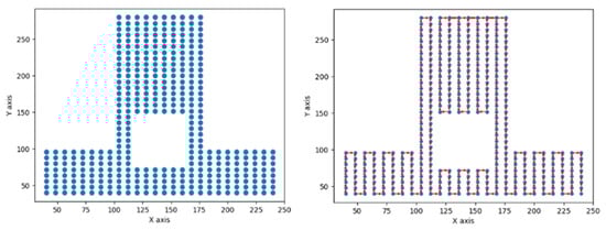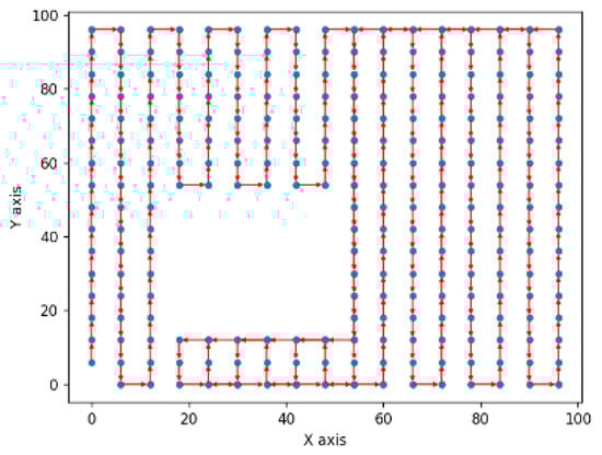 Setting off from the coordinate (0, 0), the algorithm operates according to its pre-determined logic to identify the next feasible node, whilst steering clear of the prohibited zones. It proceeds in this fashion until it has traversed all of the nodes within the sample, thereby formulating an optimal path for probe inspection. The global path is indicated by the red line with an arrow in Figure 7. The resultant route embodies the algorithm’s efficacy in manoeuvring through a constrained environment, and it is potentially the most efficient trajectory under the given parameters.