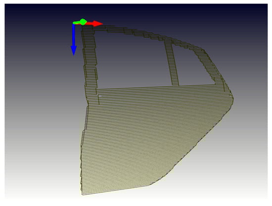 In order to further assess the performance of the algorithm, this study tested it on a 3D point cloud data model of a car door. This model was processed using the open-source software MeshLab and transformed into a point cloud representation, as shown in Figure 11, consisting of 9709 sampled points. The path result of the 3D data processed through a hybrid algorithm is shown in Figure 12, where the coordinate system is represented red, green, and blue arrows corresponding to the X, Y, and Z axes, respectively.