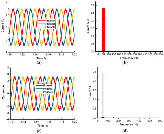 Figure 1 shows the current waveform under different operating conditions. According to Figure 1, the amplitude of the fundamental current decreases when the rotor eccentric fault occurs. When a rotor bar fault occurs, a component with a frequency of (1–2s)f is induced in the stator current, which is very close to the fundamental frequency of the stator current. Under the modulation effect of this component 2sf, the stator current undergoes periodic fluctuations.