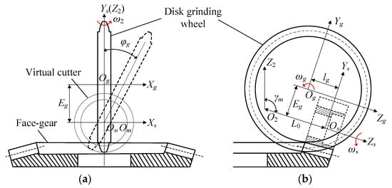 The distance between the origin O2 and Os of the two coordinate systems S2 and SS is L0, and the angle γm is the shaft angle. The center distance between the disk grinding wheel and the virtual cutter is Eg, and Eg is defined as , where rps is the radius of the pitch circle of the virtual cutter, and rg is the radius of the pitch circle of the disk grinding wheel; lg is the moving distance of the center of the disk grinding wheel. There are three kinds of motion during the grinding process: the disc-shaped grinding wheel swings around the rotation axis ZS of the virtual gear shaping cutter at an angular velocity ωs, the face gear rotates around its own rotation axis Z2 at an angular velocity ω2, and the grinding wheel rotates around its own rotation axis Xg at a high speed ωg to form a cutting motion.