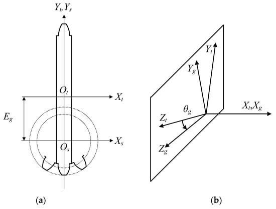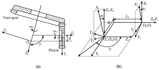 where θg is the rotation angle of the face gear; Mgs is a 4 × 4 coordinate transformation matrix from Ss to Sg; and Lgs is a 3 × 3 submatrix of Mgs. Mgs is determined via Equation (12).