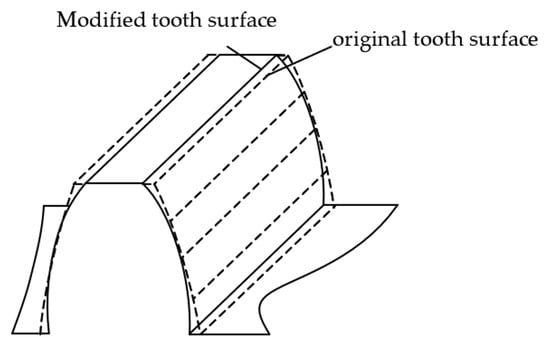 Transmission systems, which are integral to mechanical devices, benefit significantly from the enhancement of gear performance, as it directly affects the overall quality of the equipment. The modification of gear teeth is a prevalent method for enhancing the performance of gear transmission [,,,,,]. By implementing this technology, the typical line contact found on unmodified gear teeth transitions to point contact after modification. This shift notably diminishes the susceptibility to errors, resulting in a concurrent reduction in both vibration and noise while enhancing the meshing of gears []. The process of tooth modification stands out for both its effectiveness and cost-efficiency. It involves precise, micron-level alterations to the gear teeth, leaving the macro structure and overall dimensions of the gear system intact; importantly, it also does not contribute additional weight to the system. Its broad application across diverse gear-driven mechanisms underscores its utility [,,,,].