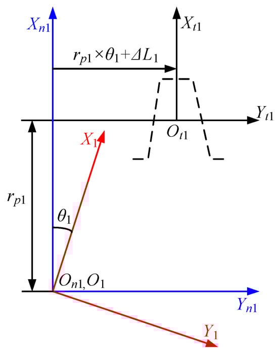 As shown in Figure 6, the pinion is generated by the modified rack-cutter. The motion of the rack-cutter and the produced pinion can be changed to achieve a different direction of tooth modification. The produced pinion’s rotating motion is represented by θ1. ΔL1 is the rack-cutter’s extra translation motion parameter, which is related to the intentional designed high-order transmission error. Sn1 is the fixed coordinate system. rp1 is the pitch radius of the pinion. St1 and S1 are the coordinate systems of the rack-cutter and generated pinion, respectively.