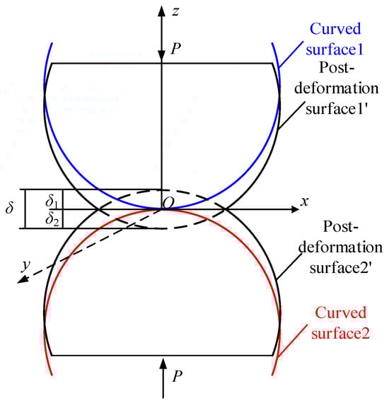 The two gears in contact are deformed by the normal load and expand into an elliptical contact area at the original contact point O, according to the Hertzian elastic contact theory [,]. The contact deformation is shown in Figure 8, where δ1 and δ2 are the shape variables of surface 1 and surface 2, respectively.