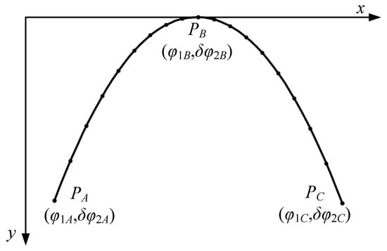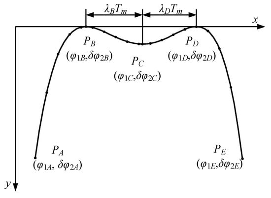 In Figure 9, the transmission error (TE) is pre-designed as a sixth-order parabolic function. The x-coordinate and y-coordinate of the five given points are the rotation angle of the pinion and the transmission error of the face gear, respectively. The points PA and PE denote the positions of the gears entering and exiting meshing, respectively. The points PB and PD are the two peaks of the curve. The point PC is the transition point in the middle, and the positional relationship between PB, PC, and PD is determined by the two parameters of λB and λD. Tm denotes the meshing period of the gears.