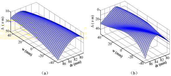 Figure 13 shows the modification amount of the cylindrical gear tooth surface under different modification methods. As shown in Figure 13a, the cylindrical gear using second-order modification has a medium convex shape, with a small amount of modification in the middle position, and a large amount of modification near the meshing in and meshing out positions. The overall modification amount transitions smoothly, but the uneven distribution of the modification amount on the tooth surface may have adverse effects. In Figure 13b, the cylindrical gear is modified according to the preset HTE. Different from the traditional convex TE, the HTE is concave, and the corresponding tooth surface modification amount is also concave. It can be clearly seen from the modification amount that the high-order modification design ensures a higher modification amount in the middle area, which can make the distribution of the modification amount on the tooth surface more reasonable. At the same time, it ensures that the stress distribution in the middle area of the gear surface is more uniform during meshing, avoiding stress concentration.