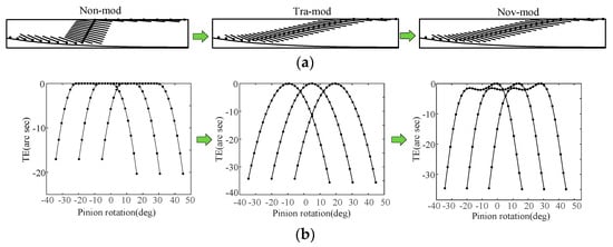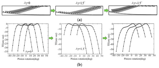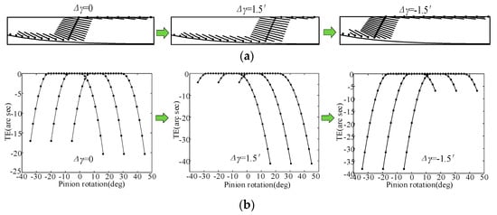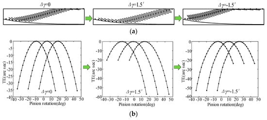 Variations in contact pattern and TE of tra-mod with misalignment error. (a) Contact pattern; (b) TEs.