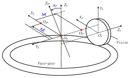 The tooth touch analysis (TCA) approach was designed to more effectively assess the real state of the tooth flanks while they are touching, and it is a numerical method to program the mesh process of the tooth flanks Σ1 and Σ2 with the use of coordinate transformations in order to obtain the contact imprints and the transmission errors. The structure of the face gear sub-structure is shown in Figure 7, with S1 being the fixed coordinate system of the cylindrical gear and S2 being the fixed coordinate system of the face gear. In the figure, B = rps − rp1 and γf = γm + Δγ, where γm is the shaft angle, and Δγ is the shaft angle error.