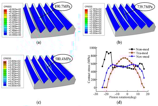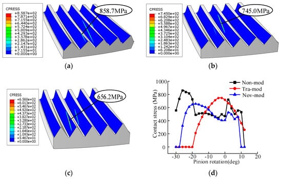 Figure 21 shows the contact stress comparison of non-mod, tra-mod, and nov-mod with misalignment error Δγ = 1.5′. Figure 21d shows the contact stress comparison of the three types of tooth surfaces during the whole process, from the gear teeth entering the mesh to exiting the mesh. The maximum contact stress of non-mod is 858.7 MPa. After tooth modification, the center of the tooth surface experiences an increase in contact stress, while the border of the tooth surface experiences a decrease in contact stress. Therefore, tooth modification is beneficial to gear transmission. However, it can also be seen from Figure 21d that the contact stress of the tra-mod in the middle area of the tooth surface increases sharply. The maximum contact stress of tra-mod is 745.0MPa. By comparing the contact stress of the nov-mod with that of the tra-mod, the advantages of the nov-mod are shown. The maximum contact stress of the nov-mod is 656.2 MPa. Compared to the tra-mod, the maximum contact stress of the nov-mod is reduced by 23.58%.
