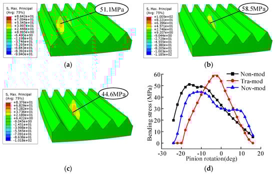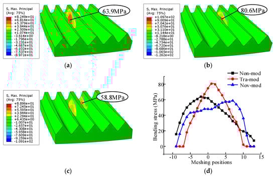 Comparison of the bending stresses without misalignment error. (a) Non-mod; (b) tra-mod; (c) nov-mod; (d) comparison of the bending stresses.