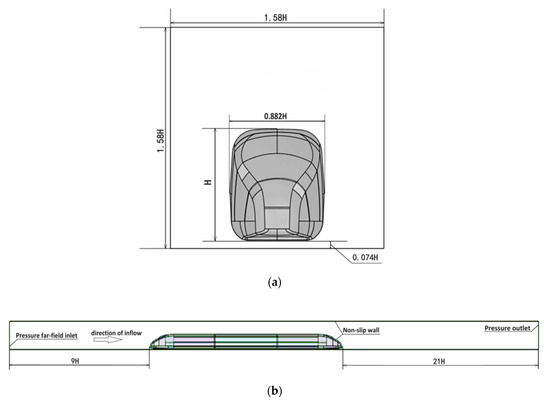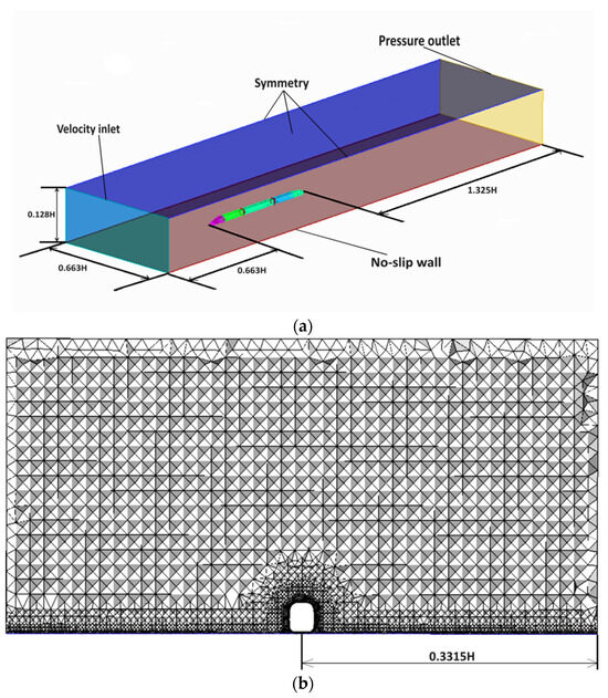 In this paper, CRH380CL, manufactured by CRRC Changchun Railway Vehicles Co., Ltd. in Changchun, China, is selected as the simulation model, the computational domain is selected, and the corresponding mesh is divided in the 2022 R1 version of ICEM CFD software provided by ANSYS, Inc. (Canonsburg, PA, USA). As shown in Figure 1a,b, the characteristic height of the train model is H = 3.8 m. The distance between the train head and the tube inlet is 9 H, the distance between the train tail and the tube outlet is 21 H, and the distance between the train bottom and the tube bottom is 0.074 H. The cross-sectional size of the tube is 1.58 H × 1.58 H. In this article, the blocking ratio of the vacuum tube is 0.356. At this point, using a low vacuum tube with a rectangular cross-section for simulation has no significant impact on the simulation results, and the influence of the tube cross-section shape on aerodynamic drag can be ignored [37].