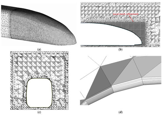 The numerical simulation of the subsequent high-speed trains will be conducted on the basis of a medium-density grid. In addition, in order to make the grid more body-fitting, triangular unstructured grids are used on the train surface, tetrahedral unstructured grids are used on the fluid domain, and encryption is performed on the surrounding fluid domain of the rear car, as shown in Figure 5a–c. After verifying the independence of the grid, it was found that the minimum grid size of the outer surface grid of the train was 10 mm, which could meet the simulation accuracy requirements. We set the boundary layer to 12 layers with a growth rate of 1.2 to capture the shear layer and separated the flow near the surface of the high-speed train unit. As shown in Figure 5d, a boundary layer grid (prism layer) is set near the body wall, and the height of the grid in the first layer of the body wall is set to 1.4818 mm to ensure y + ≥30, which is within the appropriate range of the corresponding turbulence model.