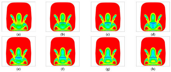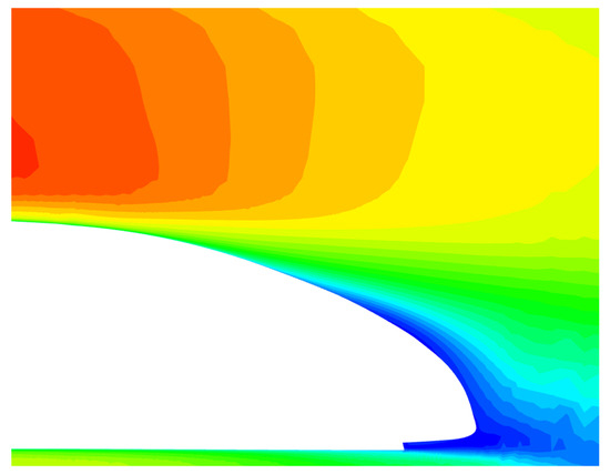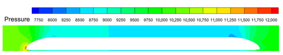 Analysis of the vacuum tube transport system’s pressure field reveals that as rolling stock moves through the tube, a complex turbulent flow field is created. The pressure contour of the surface of the rolling stock in the vacuum tube transportation system is illustrated in Figure 7. The pressure on the surface of the body of the rolling stock is not the same and it varies substantially in different portions of the rolling stock.