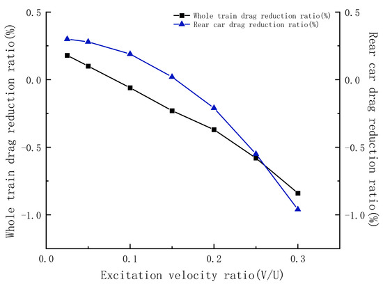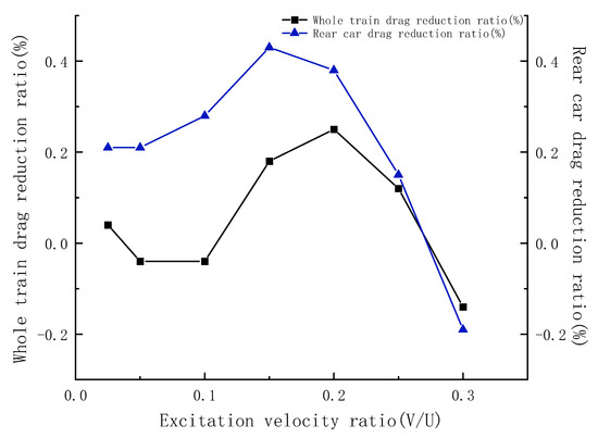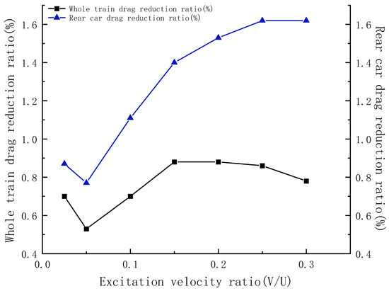 - The best drag reduction scheme can be obtained by studying the most effective way to reduce drag. The SDBD device is installed at the flow separation around the tip of the nose, and the drag reduction effect is maximized close to the excitation velocity ratio of V/U = 0.2, with the drag reduction ratio of about 0.88%; the drag reduction ratio of the rear car reaches the maximum at the excitation velocity ratio of V/U = 0.25, with the drag reduction ratio of 1.62%.