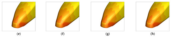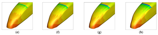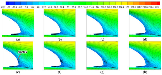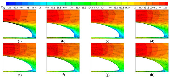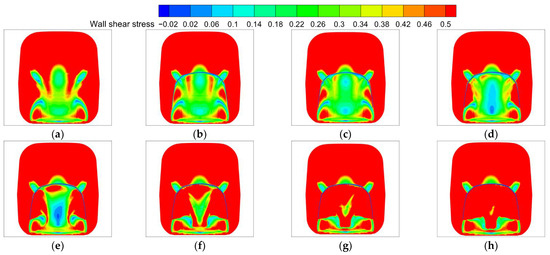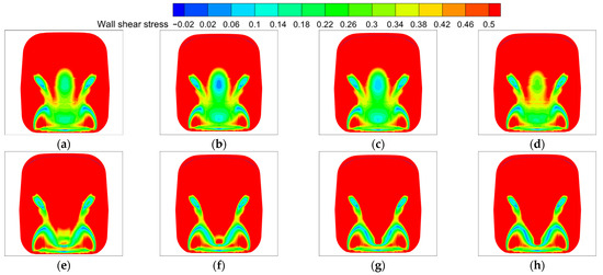 Distribution of shear stress on the rear car’s wall surface at position 4: (a) V/U = 0; (b) V/U = 0.025; (c) V/U = 0.05; (d) V/U = 0.1; (e) V/U = 0.15; (f) V/U = 0.2; (g) V/U = 0.25; (h) V/U = 0.3.