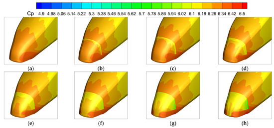 The above phenomenon is due to the generation of an excitation jet at position 4, which results in an elevated spatial position of the vortex pair and a relative reduction in the large vortex volume range and vortex scale, thereby reducing the shear force of the air on the flow field within the boundary layer, resulting in a reduction in the wall shear stress at the nose tip position.