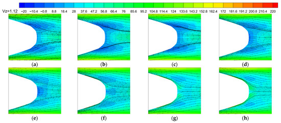 Position 1 center longitudinal profile rear train velocity contour and streamline diagrams: (a) V/U = 0; (b) V/U = 0.025; (c) V/U = 0.05; (d) V/U = 0.1; (e) V/U = 0.15; (f) V/U = 0.2; (g) V/U = 0.25; (h) V/U = 0.3.