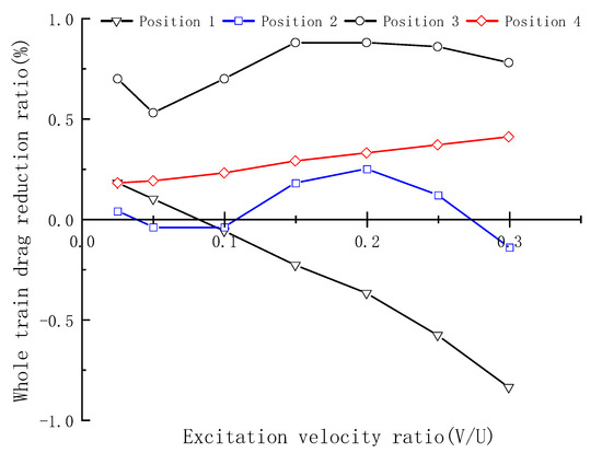 Whole-train drag reduction ratio for different excitation speeds at four positions.