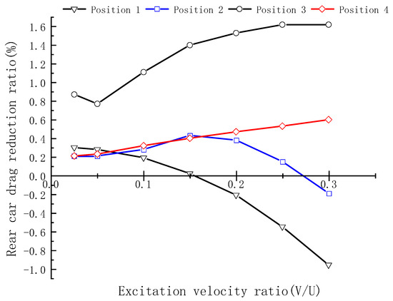 The rear car drag reduction ratio for different excitation speeds at four positions.